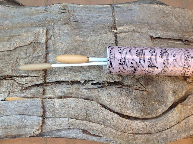 Con la fama que me he granjeado de rompe batutas (contra el atril, entre libros, sentándome...) necesitaba buscar un sistema para que me fuera más difícil destrozarlas. De momento, bonito es :-) Espero que os sea útil también a vosotros.Receta para hacer un buen Batutero(recipiente para guardar las batutas) en un pispás o para forrar cualquier cosa con "salero partituril".INGREDIENTES: - un poquito de cola blanca…