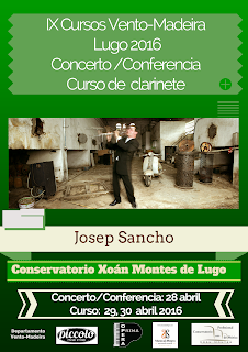 Acaba de ser presentada unha nova edición dos Cursos de Vento Madeira (...imos pola 9ª), que organiza en conxunto o Departamento de Vento Madeira do CMUS Xoán Montes de Lugo, e xa temos os boletíns de inscrición e o cartaz.O profesor de clarinete desta edición será Josep Sancho: